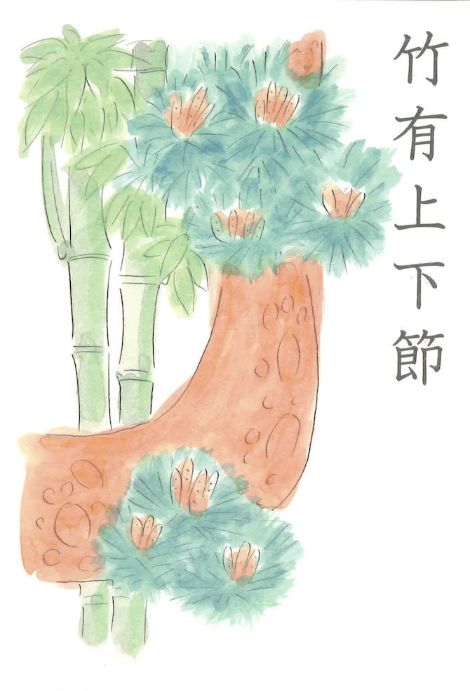 松の葉は、四季を通じ、また年を経ても古今に変わりなく常に一様の緑を見せています。一方、竹には上下の節があり、いかなる時も判然たる区別があります。どちらが良くてどちらが劣っているということはなくて、それぞれがそのままの姿で、あるがままに完成されています。